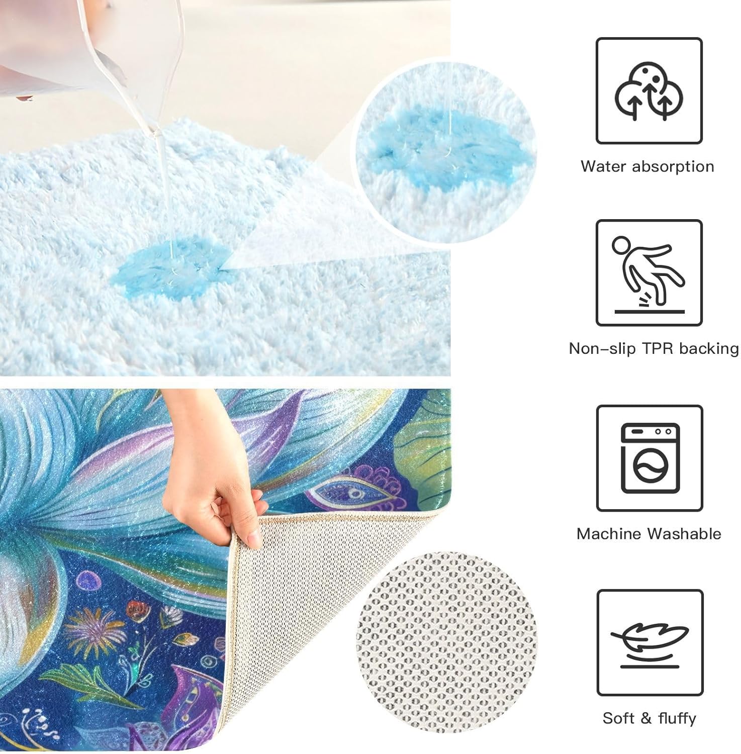 • 【Comfortable Material】 Soft Plush & Anti Fatigue. Surface long pile material, soft to the touch, high density pile, does not fade, perfect absorbent, while comfortable plush feeling, effective relief of foot pressure.